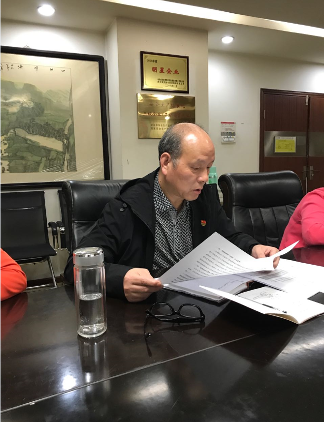 11月7日,機(jī)關(guān)黨支部組織了大約7個人左右召開支部委員擴(kuò)大會,會上集中學(xué)習(xí)十九大精神和陳一新書記講話。吳建軍書記通過通讀黨章修正案,談了自己的學(xué)習(xí)認(rèn)識,他說大家要了解這次會議以來的國家重大變化,黨的十九標(biāo)致著我國進(jìn)入新時代,是我國發(fā)展新的歷史方位,記住我國社會主要矛盾轉(zhuǎn)變?yōu)槿嗣袢找嬖鲩L的美好生活需求和不平衡不充分的發(fā)展之間的矛盾。這次將習(xí)近平新時代中國特色社會主義思想、“綠水青山就是金山銀山”等重要思想寫入黨章等都是我們要了解的。我們國家在進(jìn)步,我們作為企業(yè)一份子要把努力學(xué)習(xí)好十九大精神和陳一新書記的重要講話作為我們支部今后這一段時間要做的重要工作,結(jié)合后期將要做的培訓(xùn)活動。