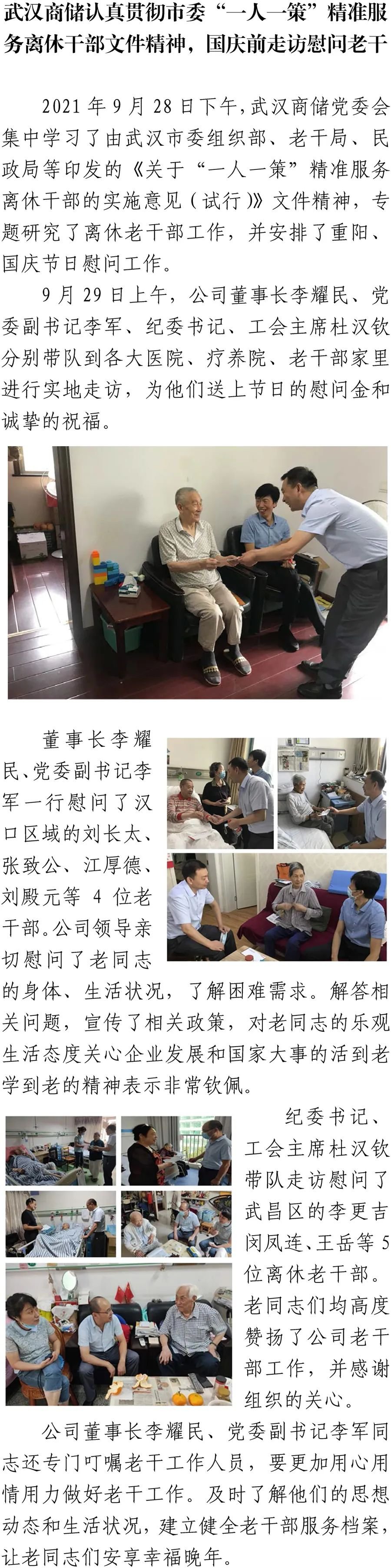 武漢商儲貫徹落實武漢市《關(guān)于“一人一策”精準服務(wù)離休干部的實施意見(試行)》 時間:2021-09-30 點擊量:次